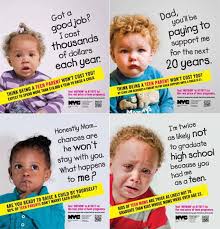 “The Real Cost of Teen Pregnancy” — a public health information campaign launched by the Mayor and Human Resources Administration of New York City in March 2013 — features babies and toddlers, primarily children of color, chastising their teenage mothers. Launched at a time when teen pregnancies have actually declined, primarily due to the availability of safe and affordable reproductive health care, the accusatory “shame and blame” narrative of these images is not only out of proportion to the “problem” it seeks to address, but is weighed down by its obvious cultural narratives about teens of color, poverty, gender and sexuality. Having a pensive toddler of color next to the slogan “Honestly Mom… chances are he won’t stay with you. What happens to me?” and a weeping boy of color next to the words “I’m twice as likely not to graduate high school because you had me as a teen,” serves to re-stigmatize single teen mothers, encouraging wider social senses of moral outrage, hostility and volatility toward young, predominantly impoverished girls of color.
